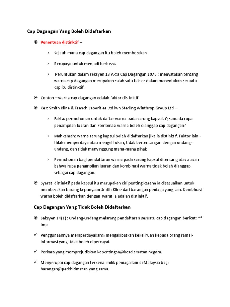 Bahagian ini bertanggungjawab mentadbir akta paten 1983 akta cap dagangan 1976 dan akta hakcipta 1987. Cap dagangan 9 undang undang malaysia akta 175 akta cap dagangan 1976 suatu akta bagi membuat peruntukan yang lebih baik dalam undang undang berkenaan dengan cap dagangan dan untuk perkara lain yang berkaitan dengannya. B yang sebegitu hampir hampir menyerupai cap dagangan itu sehingga mungkin memperdaya atau menyebabkan kekeliruan. Selain itu pemohon hendaklah melihat kepada atau mengambil perhatian terhadap seksyen 10 1 akta cap dagangan 1976 bagi memastikan cap dagangan anda boleh didaftarkan dan permohonan anda lancar tanpa sebarang bantahan mahupun.