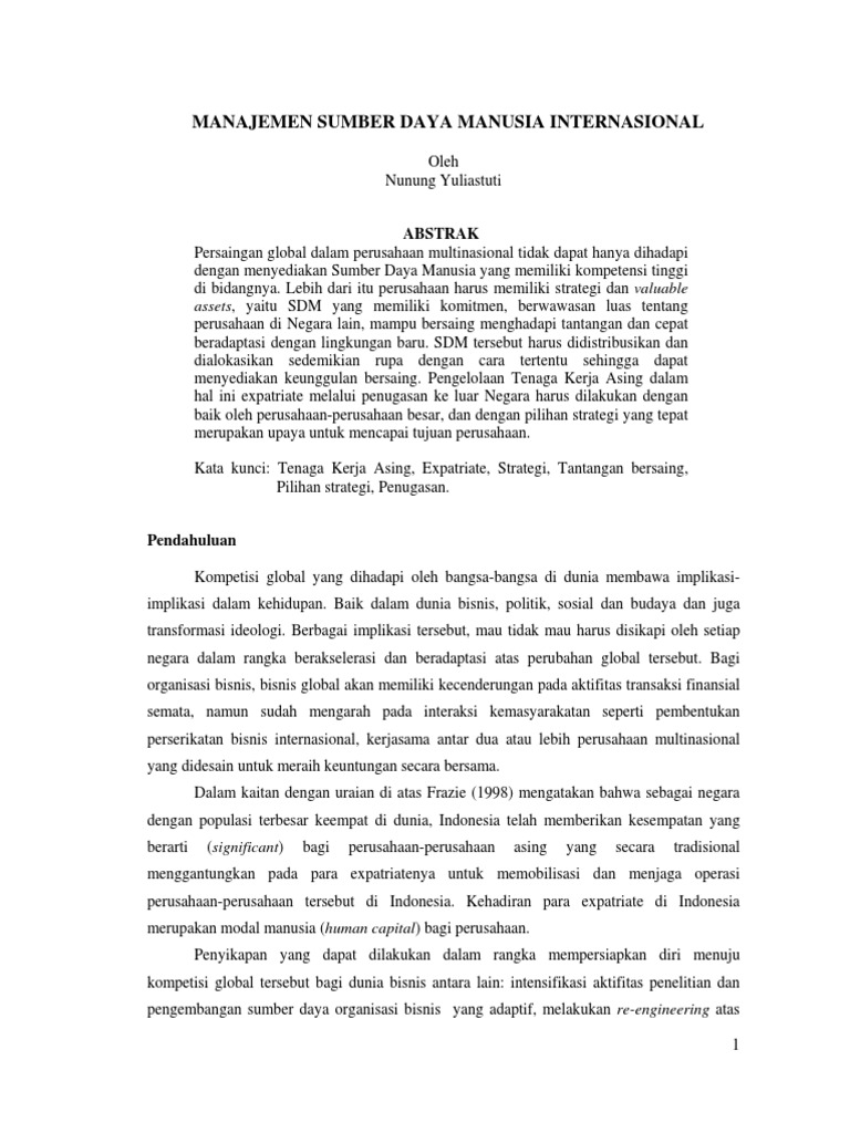 Manajemen sdm internasional disusun guna memenuhi salah satu tugas mata kuliah manajemen sumber daya manusia dosen pengampu. Sumber daya manusia atau disingkat dengan sdm adalah sebuah potensi upaya atau usaha yang bersumber dari makhluk hidup yang bernama manusia. Msdm internasional menekankan manajemen lintas budaya cross cultural management yaitu melihat. Kami menulis makalah ini bertujuan untuk mempelajari dan mengetahui ilmu tentang manajemen sumber daya manusia yang diberikan oleh dosen mengenai manajemen sumber daya manusia secara global.