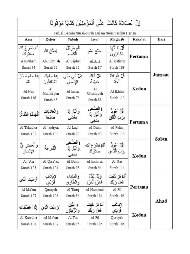 Melaksanakan sholat haruslah dilakukan dengan khusyu dan tepat waktu sesaat setelah adzan dikumandangkan. Surah yang dibaca dalam sholat 5 waktu. Solat fardu tidak boleh ditinggalkan sama sekali dalam apa keadaan sekali pun kerana ia termasuk dalam dosa dosa besar. Artikel jadwal bacaan surat dalam shalat fardhu 5 waktu ini diposting oleh joy johari pada hari sabtu 27 desember 2014.
