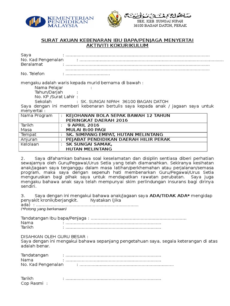 Unit Kokurikulum Surat Akuan Kebenaran Ibu Bapa Dan Penjaga Menyertai Aktiviti Kokurikulum