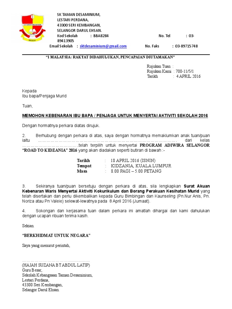 Contoh Surat Makluman Aktiviti Kokurikulum Kepada Ibu Bapa