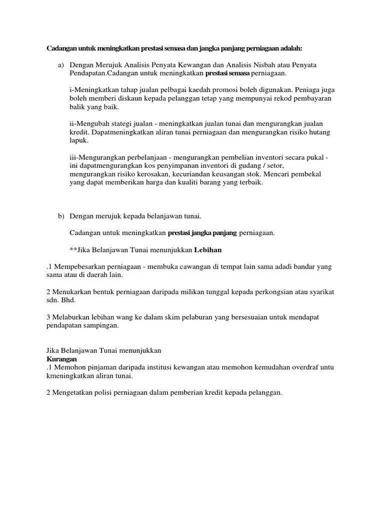 Cadangan untuk meningkatkan prestasi jangka panjang perniagaan. I meningkatkan tahap jualan pelbagai kaedah promosi boleh digunakan. Scribd is the world s largest social reading and publishing site. Peniaga boleh mengadakan promosi dan memberi diskaun kepada pelanggan tetap yang mempunyai rekod pembayaran yang baik selain itu cadangan lain ialah mengubah. Peniaga juga boleh memberi.