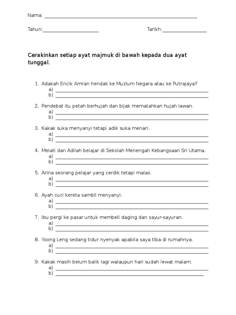 Latihan Pisahkan Setiap Ayat Di Bawah Menjadi Dua Ayat Tunggal
