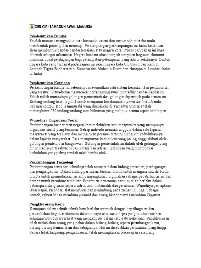 Ciri Ciri Tamadun Awal Manusia Pembentukan Bandar