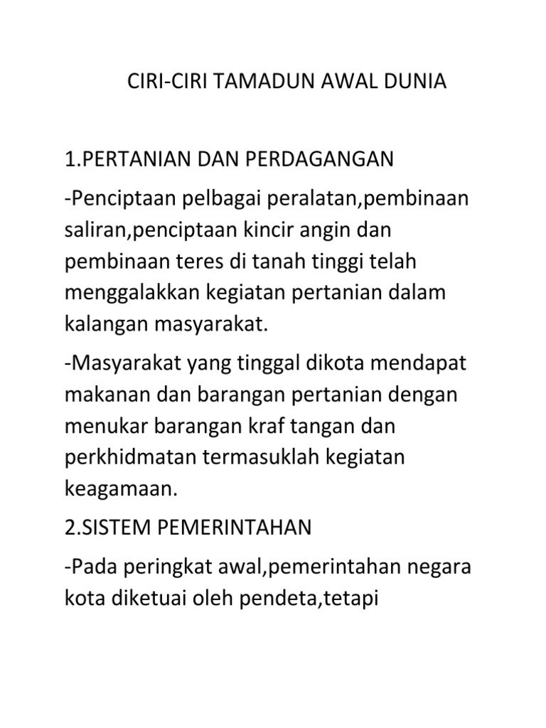 Ciri Ciri Tamadun Awal Dunia Doc Bil Ciri Ciri 1 Pertanian Dan Perdagangan 2 Sistem Pemerintahan 3 Pembentukan Bandar 4 Pengkhususan Pekerjaan 5 Course Hero