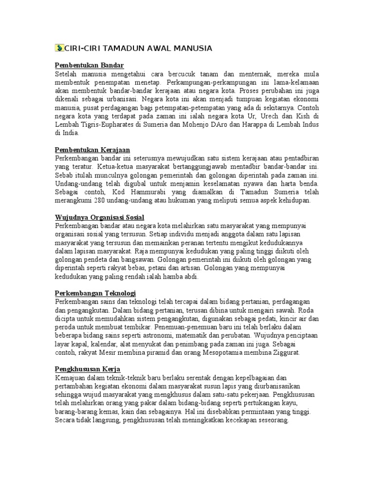 Ciri Ciri Tamadun Awal Manusia Pembentukan Bandar