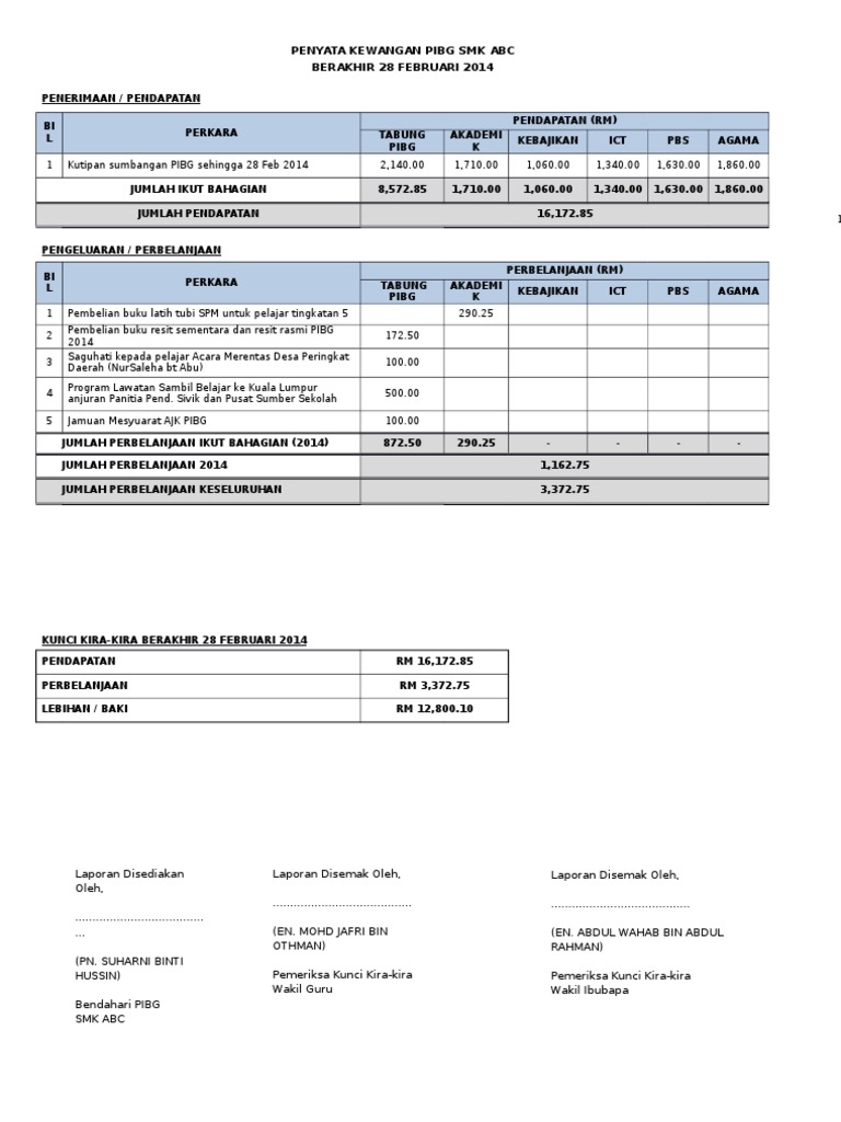 Contoh Penyata Kewangan Pibg Sekolah