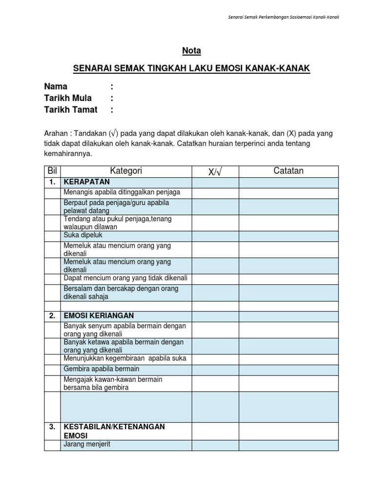 Doc Senarai Semak Tingkah Laku Emosi Kanak Kanak Hce2073 Perkembangan Sosioemosi Kanak Kanak Dalam Pendidikan Awal Kanak Kanak Nur Hidayah Academia Edu