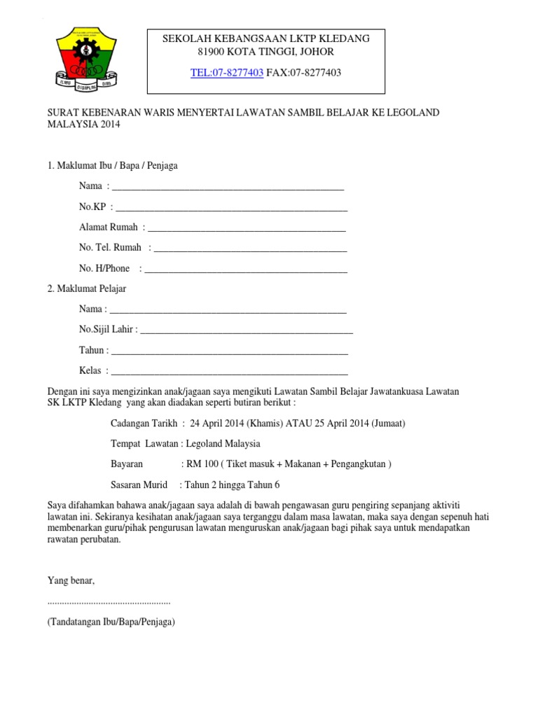 Surat Kebenaran Waris Menyertai Lawatan Sambil Belajar Ke Legoland Malaysia 2014