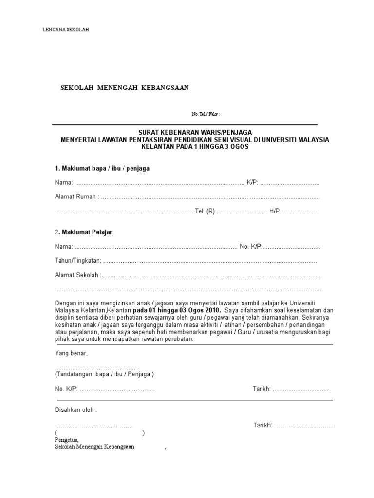 Surat Akuan Kebenaran Waris Menyertai Aktiviti Lawatan
