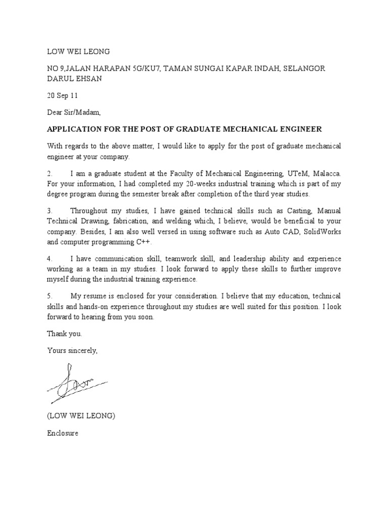 Example Of Application For Industrial Training Placement