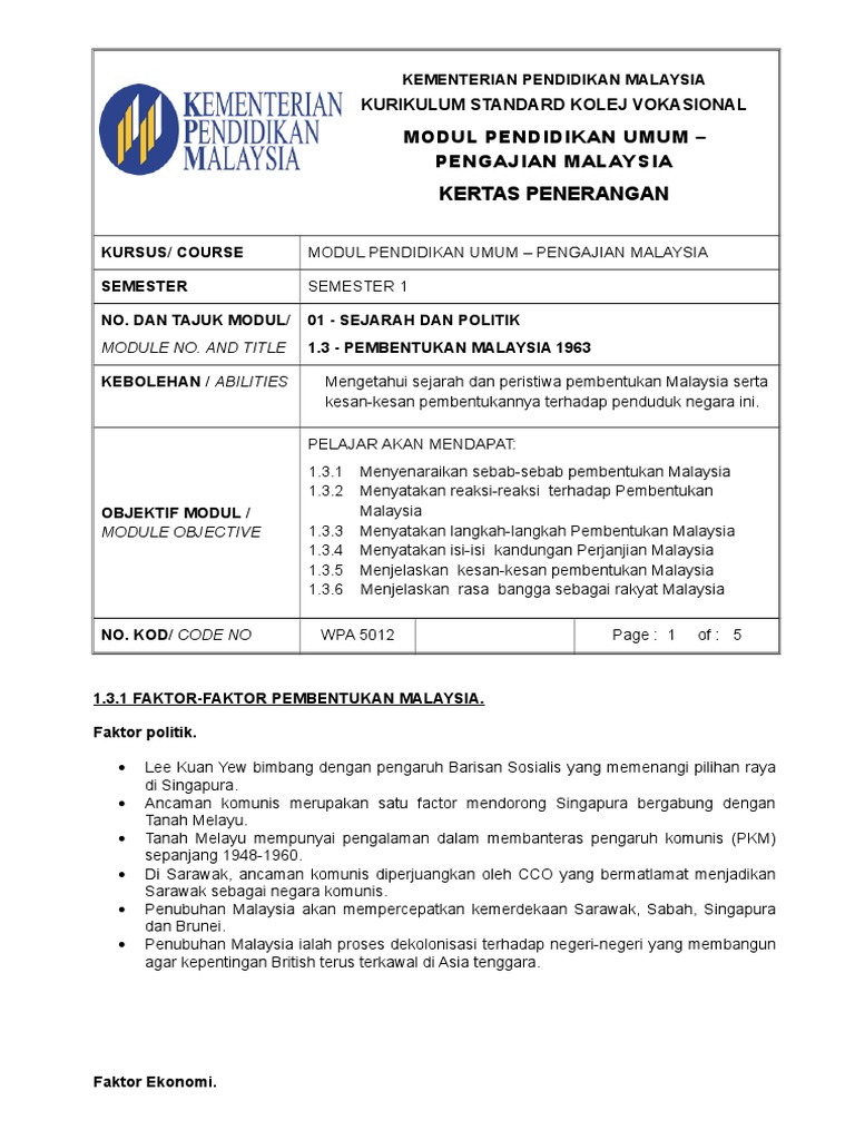 Isi Isi Perjanjian Malaysia 1963 Kepentingannya Sejarah Stpm