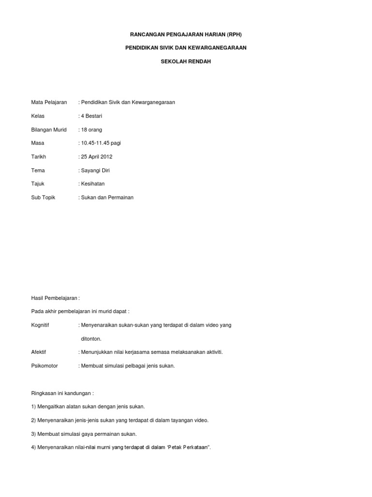 Rancangan Pengajaran Harian Psk Pendidikan Sivik Dan Kewarganegaraan