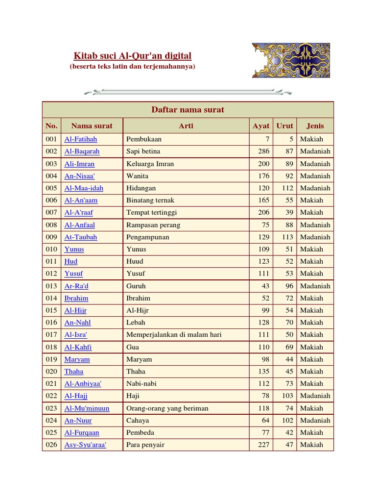 114 Surat Dalam Al Quran Beserta Arti Dan Tempat Turunnya