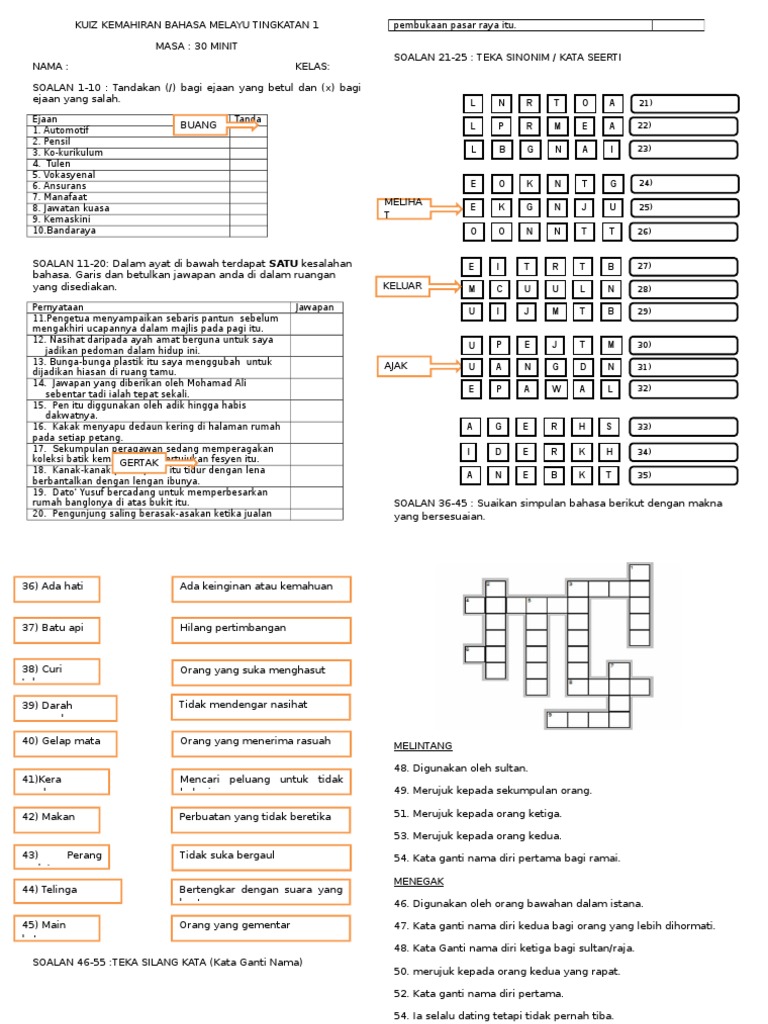 Soalan Kuiz Bahasa Melayu Tingkatan 1 Kecemasan W
