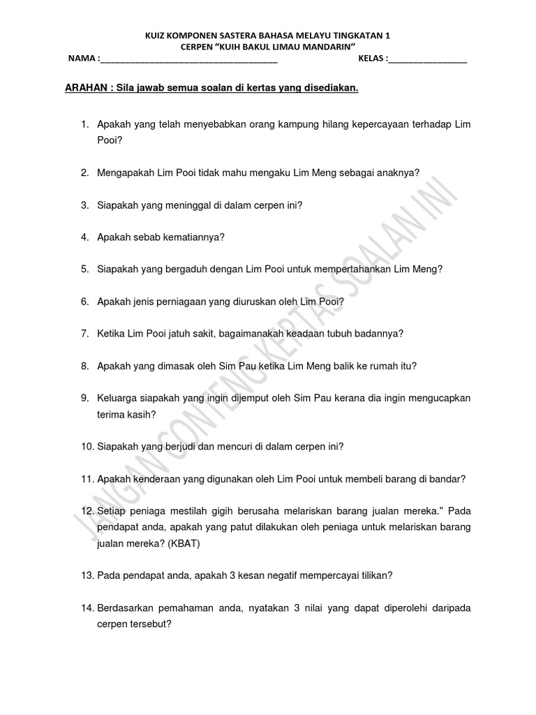 Kuiz Komponen Sastera Bahasa Melayu Tingkatan 1 Cerpen Kuih Bakul Limau Mandarin Nama Kelas