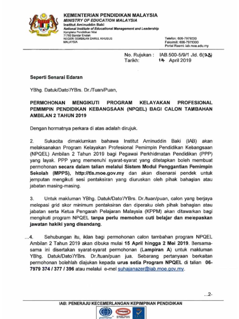 Permohonan Bagi Mengikuti Program Kelayakan Profesional Pemimpin Pendidikan Kebangsaan Atau National Professional Qualification For Educational Leaders Npqel Ambilan Tahun 2021 Portal Rasmi Institut Aminuddin Baki