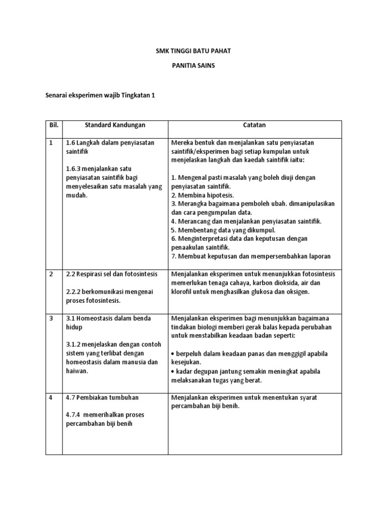 Senarai Eksperimen Wajib Sains Tingkatan 1