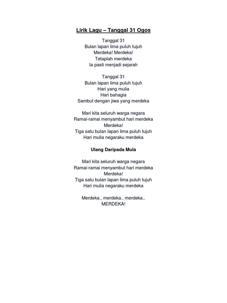 Lirik lagu tanggal 31 ogos. Tanggal 31 bulan lapan lima puluh tujuh hari yang mulia hari bahagia sambut dengan jiwa yang merdeka. Tetaplah merdeka ia pasti menjadi sejarah tanggal 31 bulan lapan lima puluh tujuh hari yang mulia hari bahagia sambut dengan jiwa yang merdeka. Lirik lagu sudirman tanggal 31 ogos tanggal tiga puluh satu bulan lapan lima puluh tujuh merdeka merdeka tetaplah merdeka ia pasti menjadi sejarah tanggal tiga puluh satu bulan lapan lima puluh tujuh hari yang mulia hari bahagia sambut dengan jiwa yang merdeka mari kita seluruh warga negara. Tetaplah merdeka ia pasti menjadi sejarah.