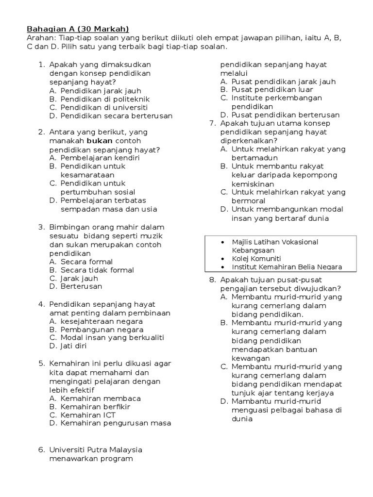 Bahagian A 30 Markah Majlis Latihan Vokasional Kebangsaan Kolej Komuniti Institut Kemahiran Belia Negara