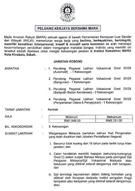 Peluang Kerjaya Bersama Mara Permohonan Online Sebagai Pembantu Pegawai Latihan Vakasional Gred Dv19 Pelbagai Bidang Mereka Yang Bermin Need A Job Job Online