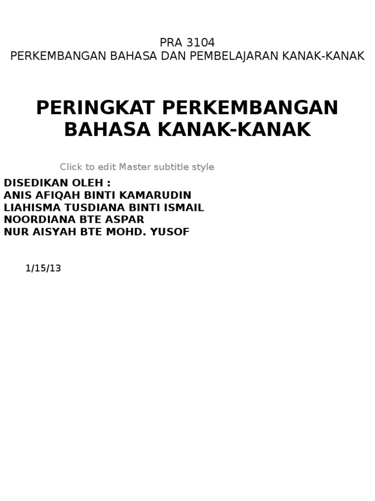 Peringkat perkembangan bahasa kanak kanak. Kanak kanak selain menerima latihan bahasa yang pasif daripada ibu bapa mereka juga dapat memproses bahasa secara aktif kerana memiliki struktur dalaman dalam memperolehi bahasa. Anak anak yang berada dalam lingkungan usia 2 3 tahun mereka sepatutnya. Namun isyarat nangis boleh menyatakan yang dia lapar lampin basah tidak selesa tidak lena tidur dan sebagainya. Peringkat awal kanak kanak 3 8 tahun kanak kanak dapat bermain menggunakan imaginasi perkembangan bahasa yang cepat penggunaan otot otot halus dan kebolehan bersosial.
