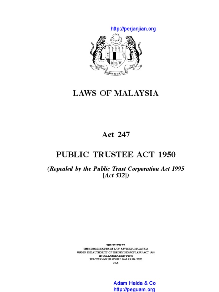 Public trust corporation act 1995. 2 this act shall come into force on such date as the minister may by notification in the gazette appoint and the minister may appoint different dates for the coming into force of all or different provisions of this act in respect of different states or parts of malaysia. Tabung haji act 1995 act 535 536. Office of public trustee part 2 published under the. Perbadanan putrajaya act 1995 act 536 537.