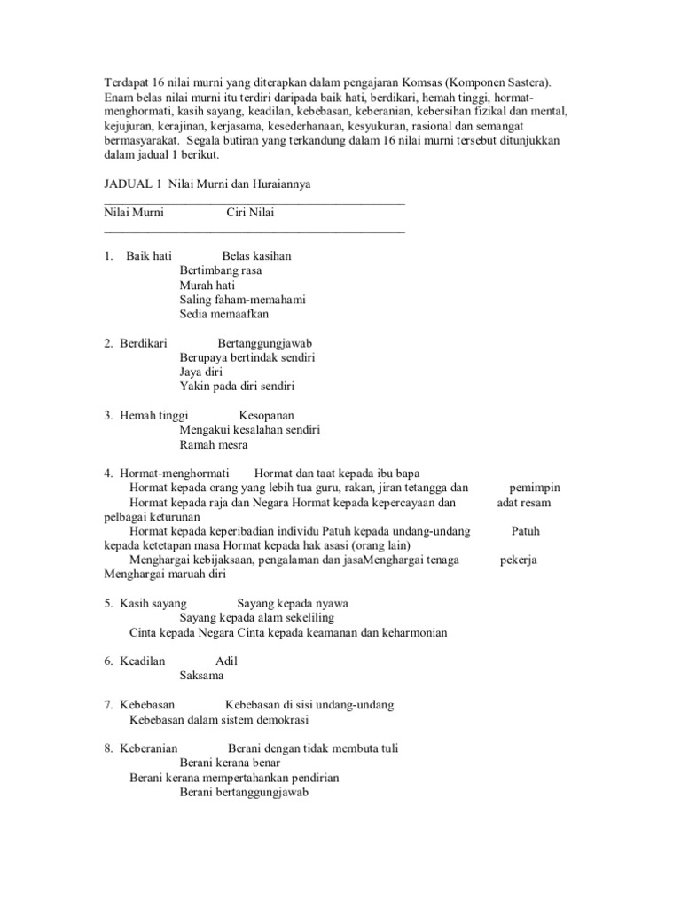 Senarai Nilai Murni Dalam Subjek Bahasa Melayu