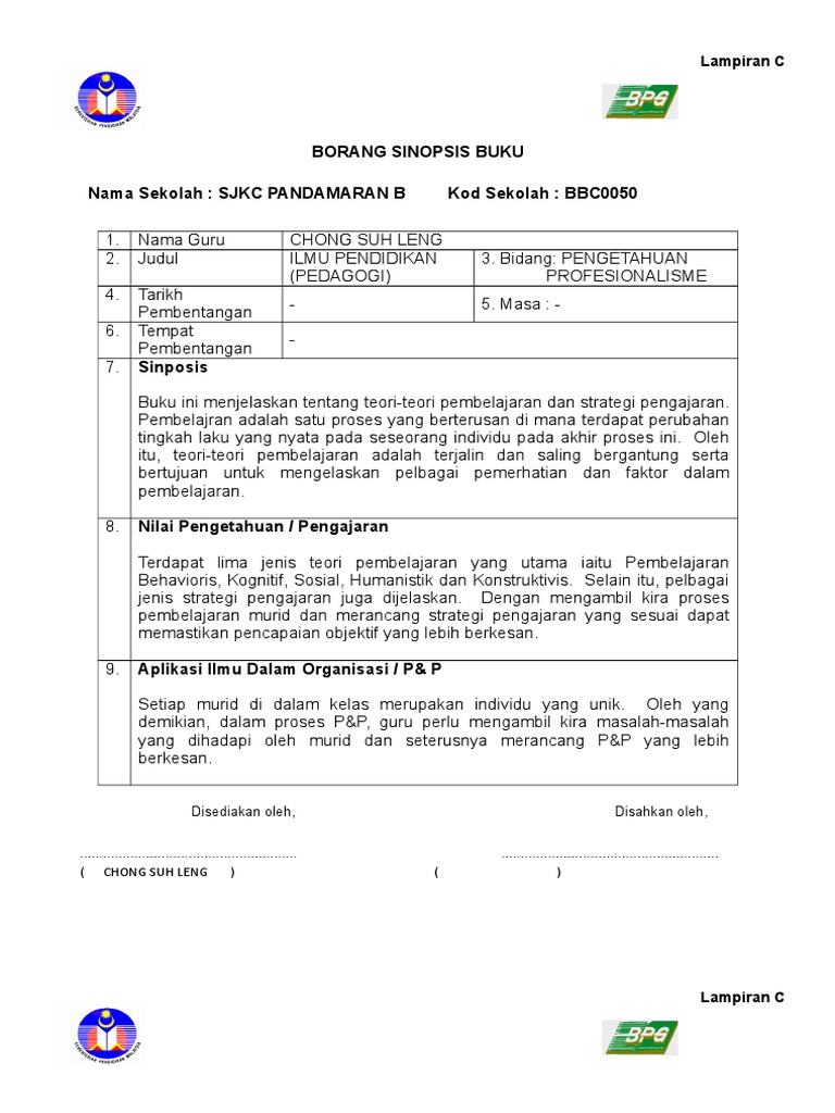 Borang Sinopsis Buku Nama Sekolah Sjkc Pandamaran B Kod Sekolah Bbc0050