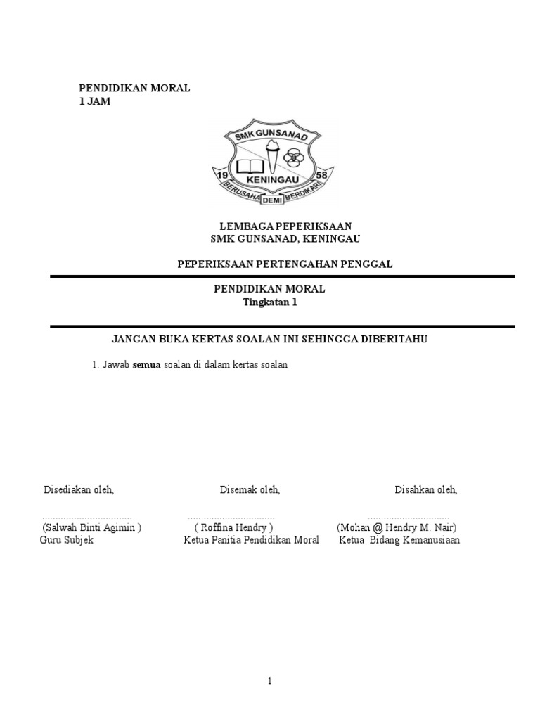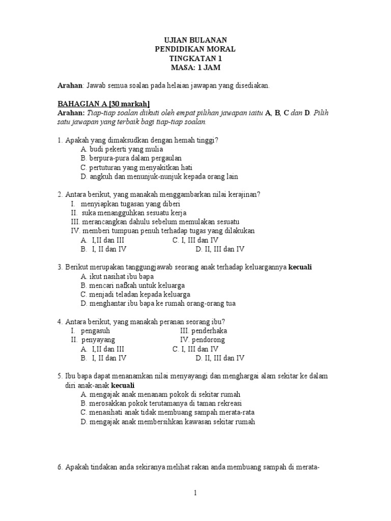 Soalan Peperiksaan Akhir Tahun Pendidikan Moral Tingkatan 3 Bernilai Soalan Pendidkan Moral Tingkatan 1 Skoloh