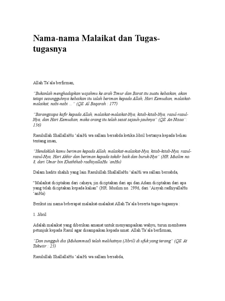 Nama Nama Malaikat Dan Tugas Tugasnya