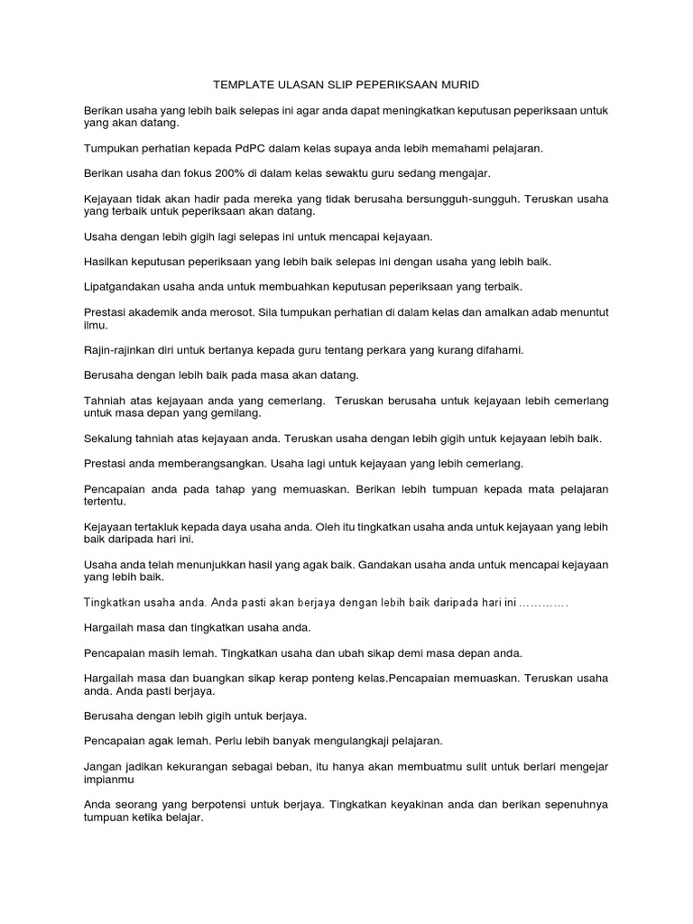 Panduan ulasan dalam slip keputusan peperiksaan murid saps sebagai panduan kepada guru kelas dalam menulis ulasan dalam slip keputusan. Contoh ulasan guru kelas dalam saps dan buku pelaporan pada 17 11 2016 jumlah.