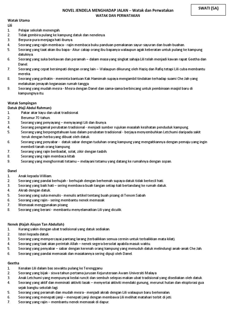 Novel Jendela Menghadap Jalan Watak Dan Perwatakan Swati