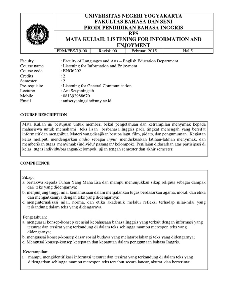Universitas Negeri Yogyakarta Fakultas Bahasa Dan Seni Prodi Pendidikan Bahasa Inggris Rps Mata Kuliah Listening For Information And Enjoyment Kuliah Komunikasi Manusia